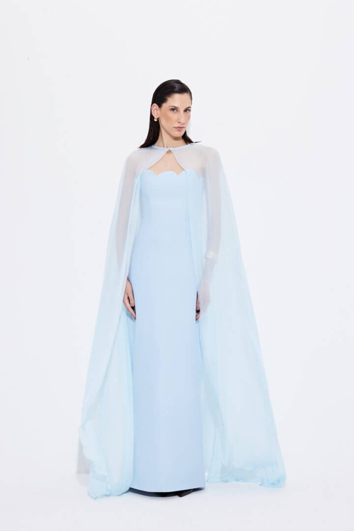 VESTIDO LONGO TOMARA QUE CAIA ONDAS COM CAPA